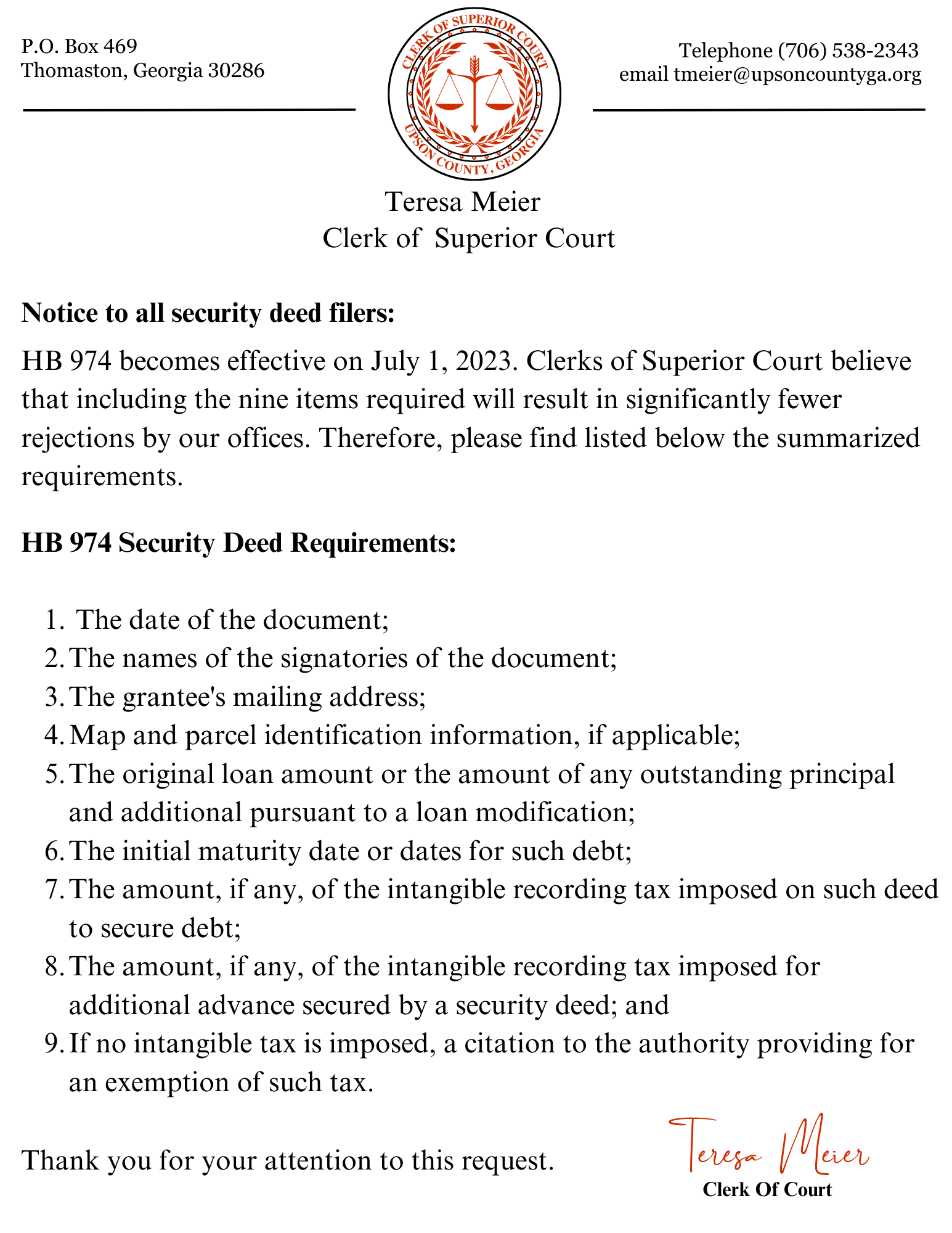 HB 974 took effect on July 1, 2023. Clerks of Superior Court believe that including the nine items required will result in significantly fewer rejections by our offices. The summarized requirements can be viewed by clicking the image on the right.